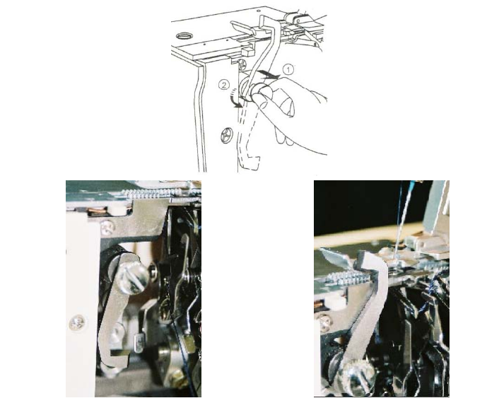 Üks praktiline näide jutu juurde - pildil on näidatud ühe overloki noa üles ja alla keeramine, ehk aktiveerimine ja deaktiveerimine. See pilt on pärit kasutusjuhendist, millelt on selgesti näha, kuidas seda tegema peab - tõmbad lihtsalt veidi väljapoole ja keerad noa alla või üles.