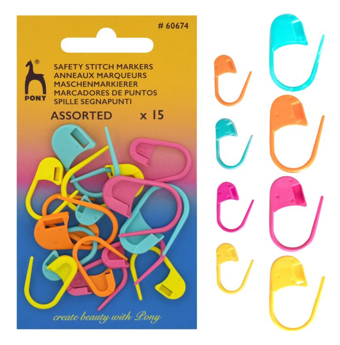 Pony silmusemärkijad 60674, pakis on 15tk, erinevas mõõdus ja värvitoonis. Suuremad (10-12mm vardale samuti sobivaid on pakis). Ideaalne tarvik kudumisel ja heegeldamisel ridade, kokkuvõtu vm. kohtade märkimisel, mustrikordade märkimisel jne. Plastikust, avatavad haaknõela põhimõttel